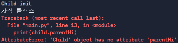 - 실행을 해보면 child.hi은 잘 호출이 되지만 상속받은 parent의 속성을 호출을 못했는데 에러가 발생한 이유는 parent의 __init__ 메서드가 실행되지 않았기 때문입니다. 즉, Parent 클래스의 __init__이 실행되지 않았기 때문에 parentHi 속성이 존재하지 않기 때문에 발생하는 에러입니다.