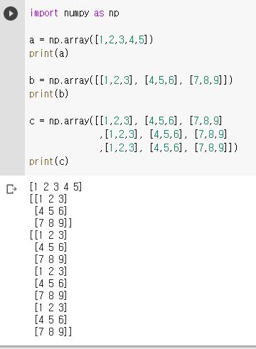 - a는 1차원 array를 만든 것이며 b는 2차원, c는 3차원이며 그림을 보시면 이해가 빠르게 될 것입니다.