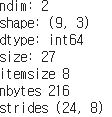 strides : 다음 요소로 넘어갈 때의 바이트 수를 나타냅니다. (1,2,3)에서 1에서 2로 넘어갈 때 8차원을 넘어갈 때는 24를 나타냅니다.
