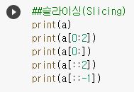 - 인덱스 자리에 콜론( : )로 범위를 지정하면 슬라이싱이 가능합니다. 이때 끝 인덱스는 슬라이싱 결과에 나오지 않습니다.