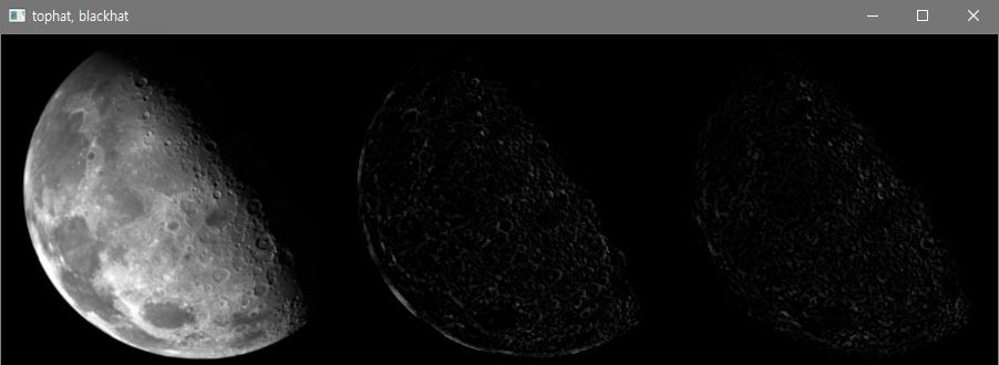 - op는 각각 MORPH_TOPHAT, MORPH_BLACKHAT이며 결과로 보면 달의 밝은 부분과 어두운 부분이 강조된 것을 볼 수 있습니다.