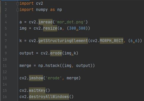 - 침식 연산을 위한 함수는 cv2.erode(src, kernel)입니다.