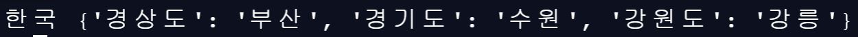 location("한국", 경상도 = "부산", 경기도 ="수원" , 강원도 = "강릉")