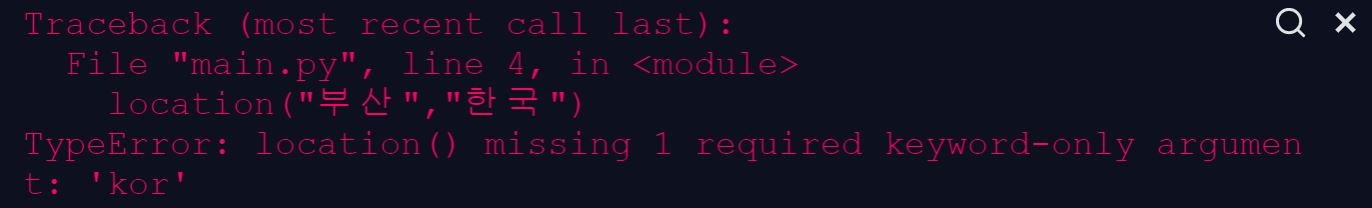 location("한국", "부산", "수원", "강릉", 경상도 = "부산", 경기도 ="수원" , 강원도 = "강릉")