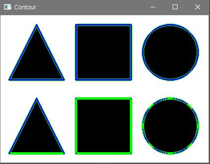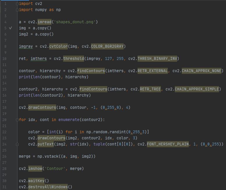 - 두번쨰 contour2는 cv2.RETR_TREE를 써서 모든 컨투어를 계층으로 수집했습니다.
