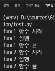 만약 정의된 함수가 많고 그 함수마다 시작과 끝을 알려줘야 한다면 함수를 만들 때마다 print 문을 넣어줘야 합니다.