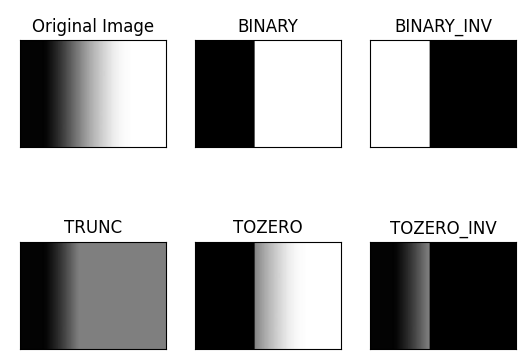 titles = ['Original Image', 'BINARY', 'BINARY_INV', 'TRUNC', 'TOZERO', 'TOZERO_INV']