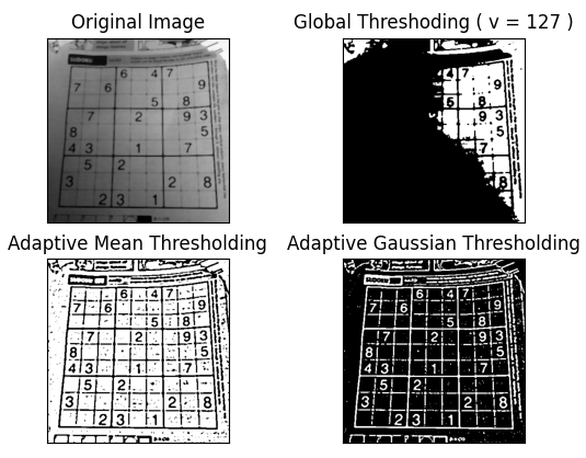 titles = ['Original Image', 'Global Threshoding ( v = 127 )', 'Adaptive Mean Thresholding', 'Adaptive Gaussian Thresholding']