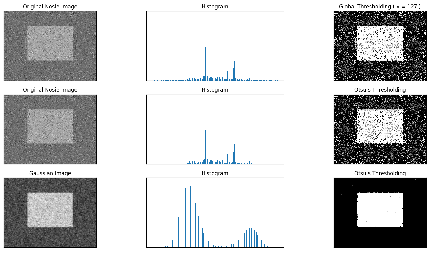'Original Nosie Image', 'Histogram', "Otsu's Thresholding",