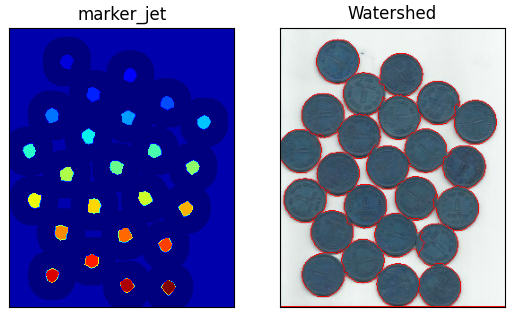 - 결과를 보시면 marker를 JET 컬러 맵으로 나타내었습니다. 짙은 파란색은 unknown의 영역을 보여주며 동전 부분은 각기 다른 색의 값들로 되어있습니다. 배경이 확실한 영역은 unknown 영역에 비해 밝은 파란색으로 보입니다.