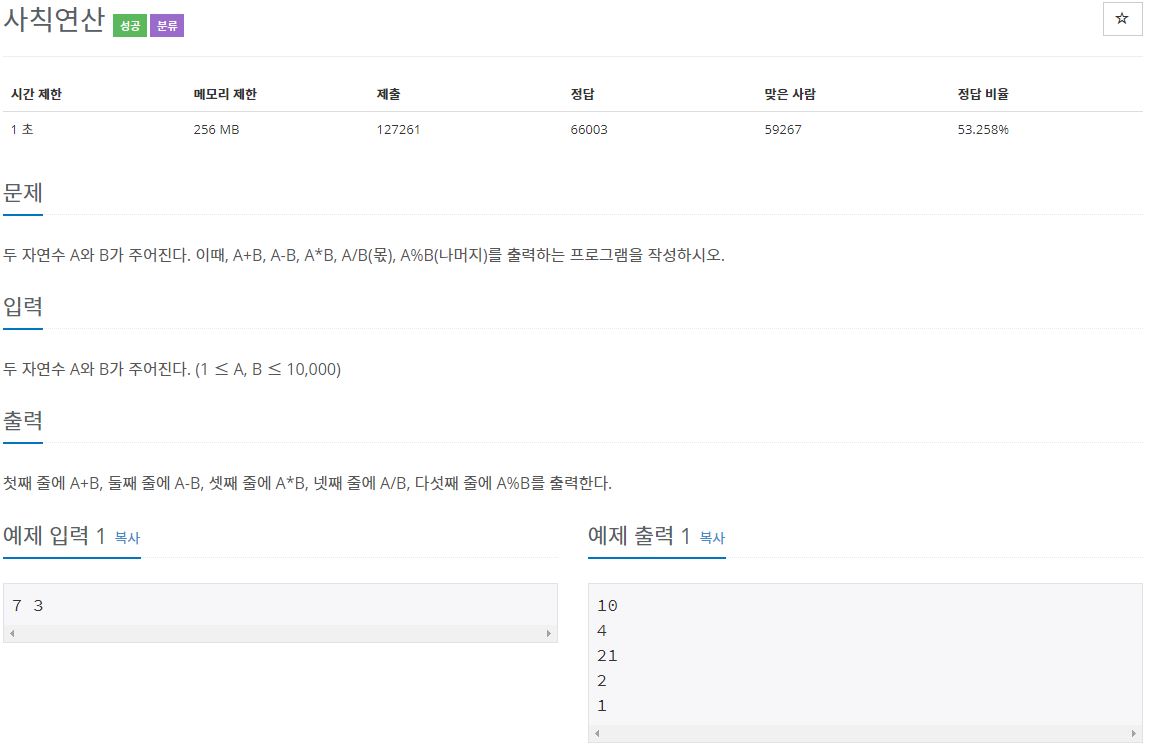 이번 10869번 사칙연산 문제는 두 개의 수를 입력받고