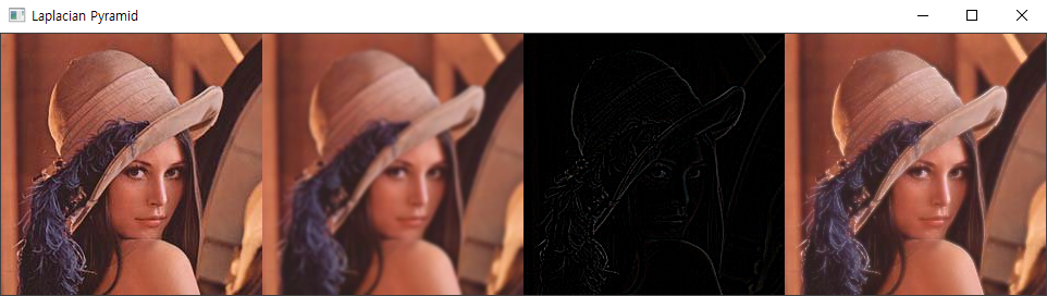 - 앞서 가우시안 피라미드로 나온 결과를 보시면 pyUp()으로 이미지를 확대하면 화질이 떨어지는 것을 볼 수 있습니다. 이런 문제점을 해결하기 위해 라플라시안 피라미드를 사용합니다.