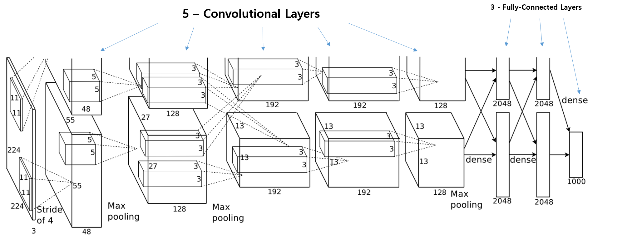 - 위 그림과 같이 AlexNet은 5개의 convolution layers와 3개의 full-connected layers 구성되어 있다.