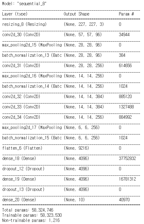 - 논문에서 설명한 것처럼 만들었고 input을 227x227로 resize 하여 모델링을 하였습니다.