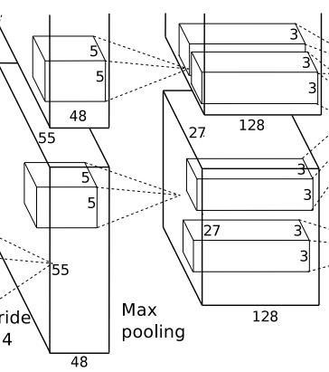 → CNN에서 보통 Pooling은 컨볼루션으로 얻은 feature map의 크기를 줄이기 위해 사용되며 AlexNet에서는 Max Pooling을 3x3으로 사용하며 stride를 2로 하여 사용하여 출력 영상의 크기가 1/2로 줄어들게 되었다.