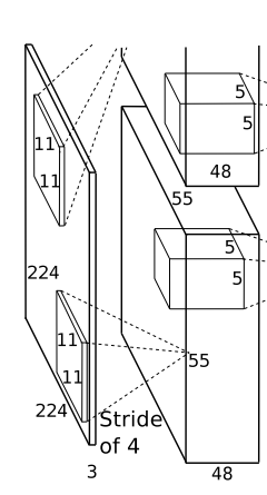 → 96개의 11x11x3 필터로 input을 컨볼루션 한다. stride를 4로 했고 padding은 사용하지 않음