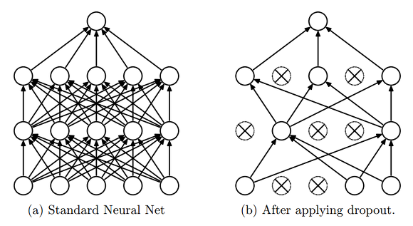→ 과적합 (overfitting)을 막기 위한 기술인 dropout은 fully-connected layer의 뉴런 중 일부를 생략하면서 학습을 진행하는 것입니다.